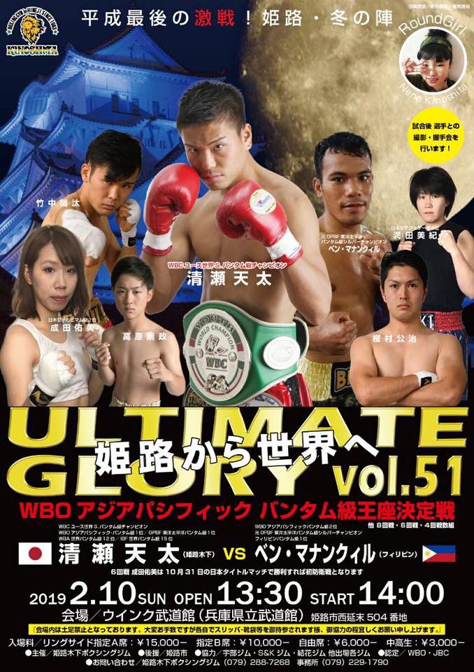 ULTIMATE GLORY VOL.51 WBO-APタイトルマッチ 2019-02-10 ウインク武道館(兵庫県姫路市) 14:00開始 主催:姫路木下ジムチケット窓口&お問合せ:079-288-7268 Tweet